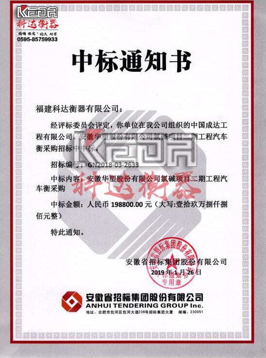 熱烈祝賀福建科達(dá)中標(biāo)安徽氯堿項(xiàng)目汽車衡采購