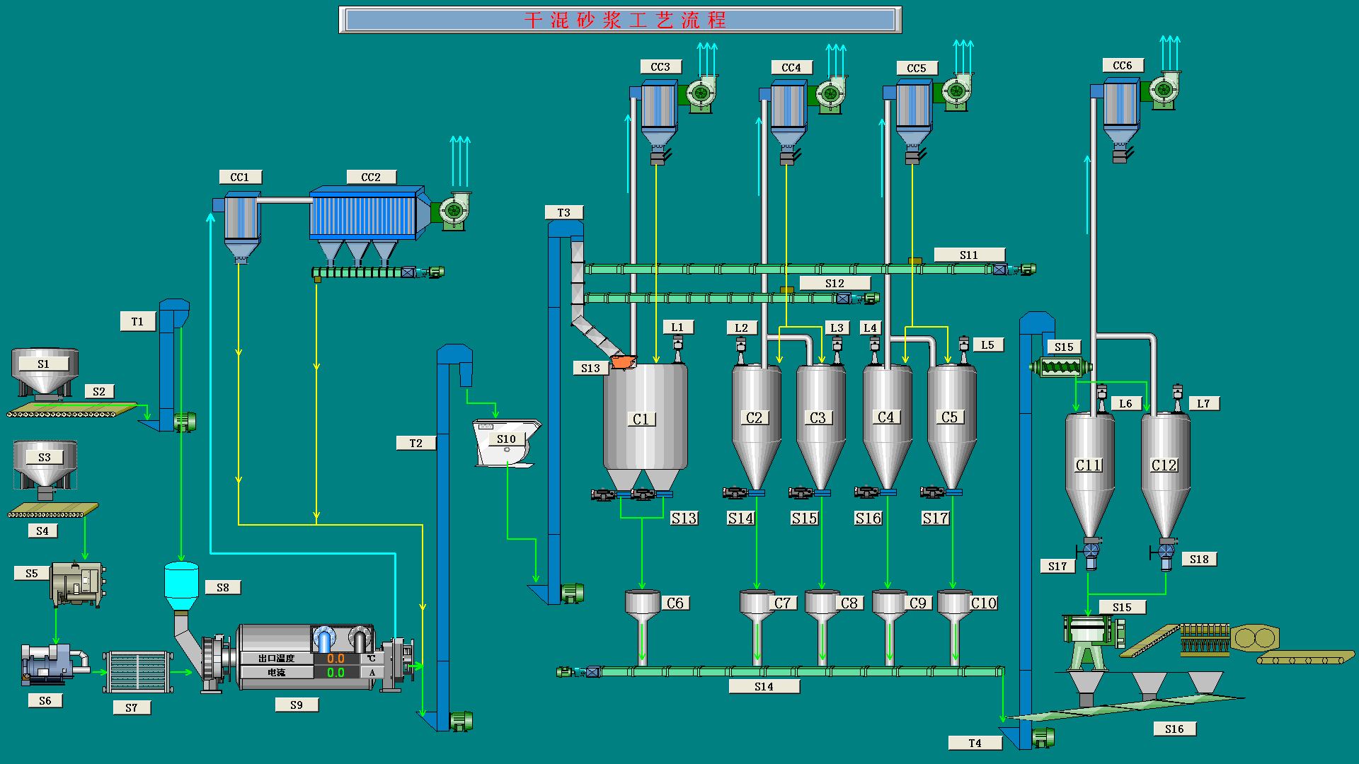 一條生產(chǎn)線可生產(chǎn)多個(gè)品種,可生產(chǎn)干混內(nèi)墻砌筑砂漿、干混內(nèi)墻抹灰砂漿、干混外墻抹灰砂漿、干混?;⒅檩p質(zhì)砂漿等產(chǎn)品。